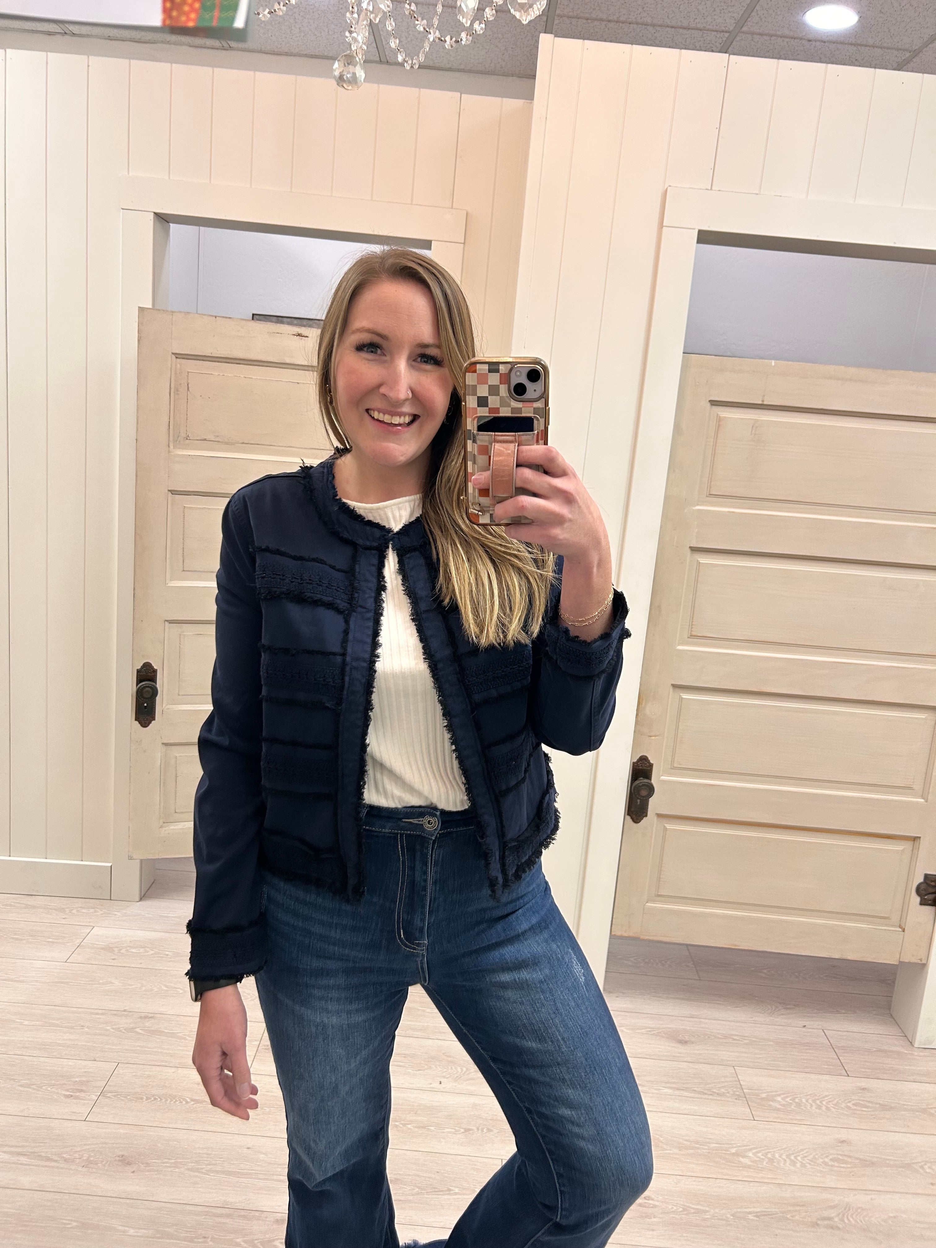 Elevate your denim game with this stunning Liverpool Navy Denim Jacket! Featuring a beautiful dark navy color and trendy frayed edges, this open-style jacket is the perfect layering piece to add effortless style to any outfit.